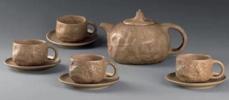 這一套茶具創(chuàng)造的閉頭是供春壺的身筒和杯子的身筒,由于供春壺壺身是“樹癭”,也即是大樹虬枝上的樹瘤,有凹有凸。樹癭紋路要亂而沒有散,完全效驗(yàn)又央求骨血?jiǎng)蚝?、精力豐滿,藝術(shù)作風(fēng)協(xié)調(diào)一致。
